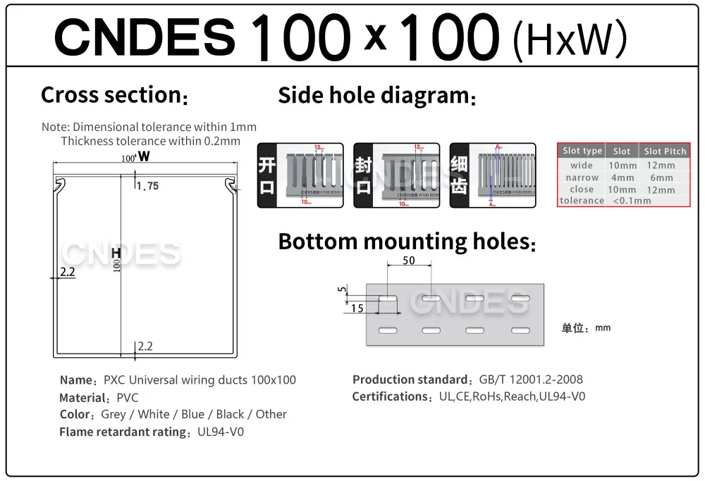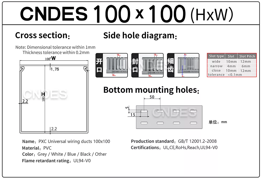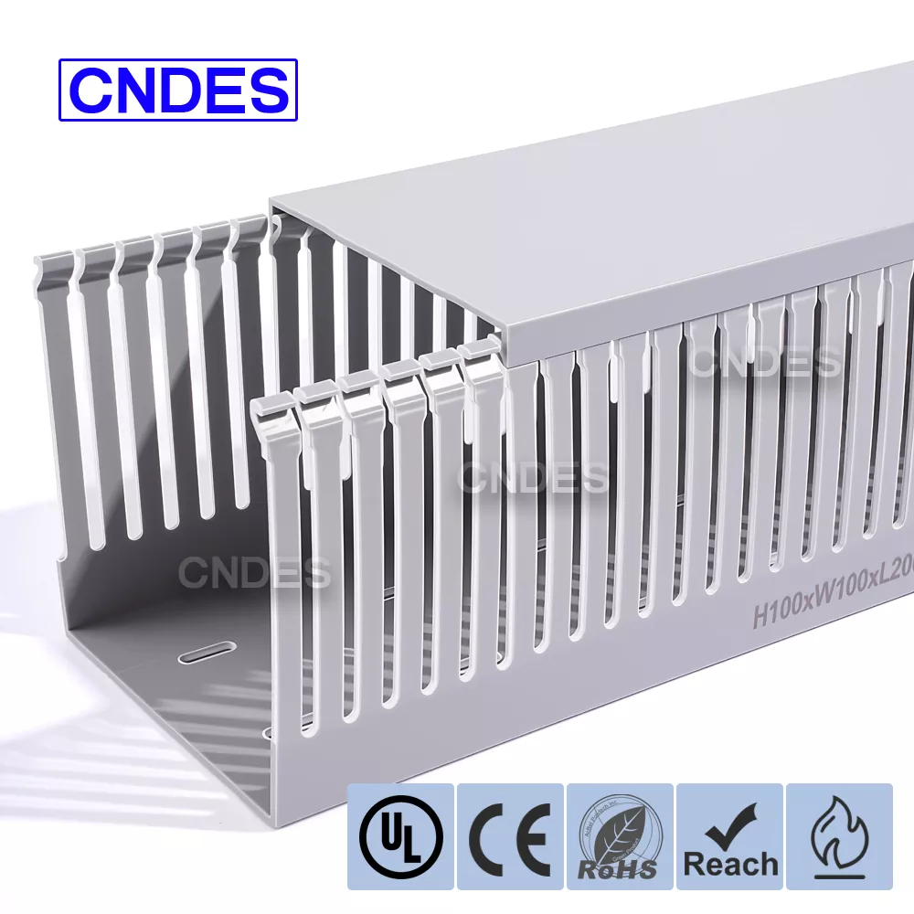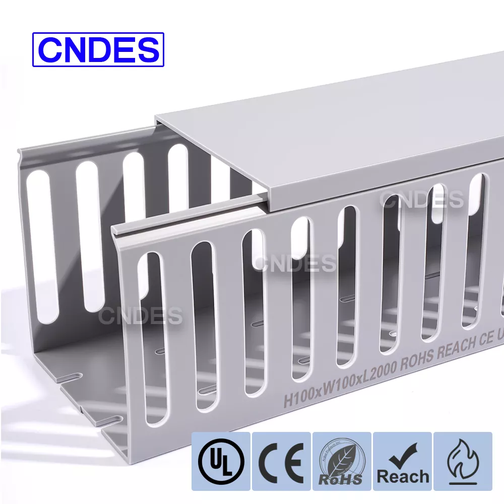 Optimaliseer uw bekabelingsprojecten met onze op maat gemaakte 100×100 kabelgoten voor draadbeheer. Als toonaangevende fabrikant en leverancier van PVC-kabelgoten in China biedt CNDES betrouwbare, uiterst nauwkeurige en aanpasbare oplossingen voor al uw kabelbeheerbehoeften. Wij beschikken over alle specificaties van draadgoten (kabelgoten). Als u andere specificaties nodig heeft, neem dan gerust contact met ons op!