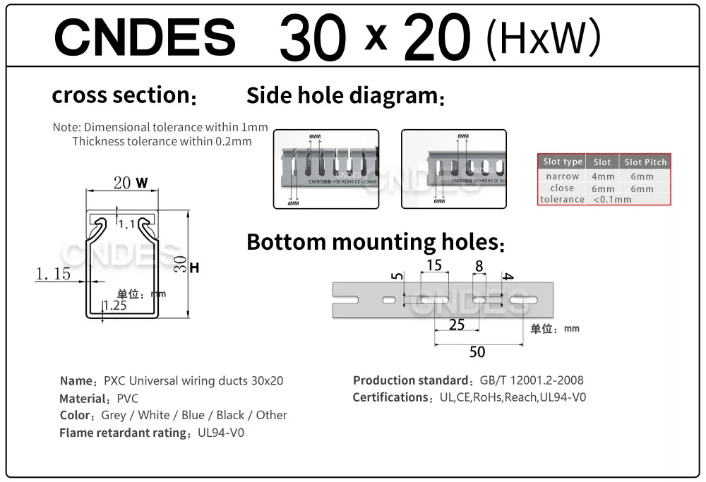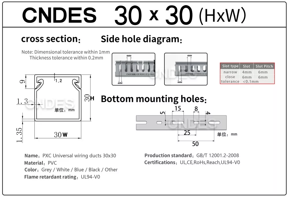 Het bevat informatie zoals de dikte, afmetingen en boringen van onze hoogwaardige PVC-kabelgoot met 30 mm hoogte en sleuf.