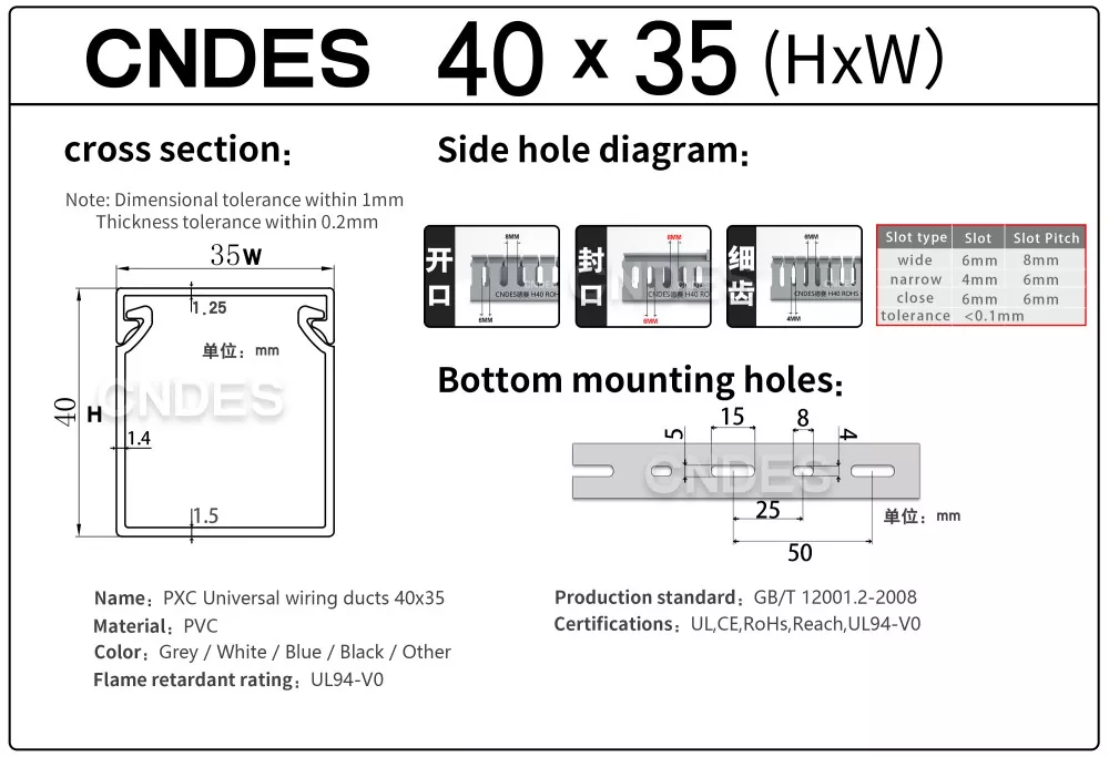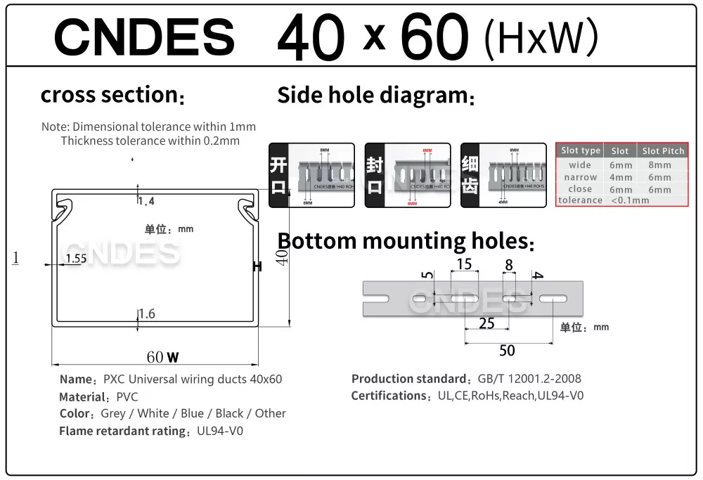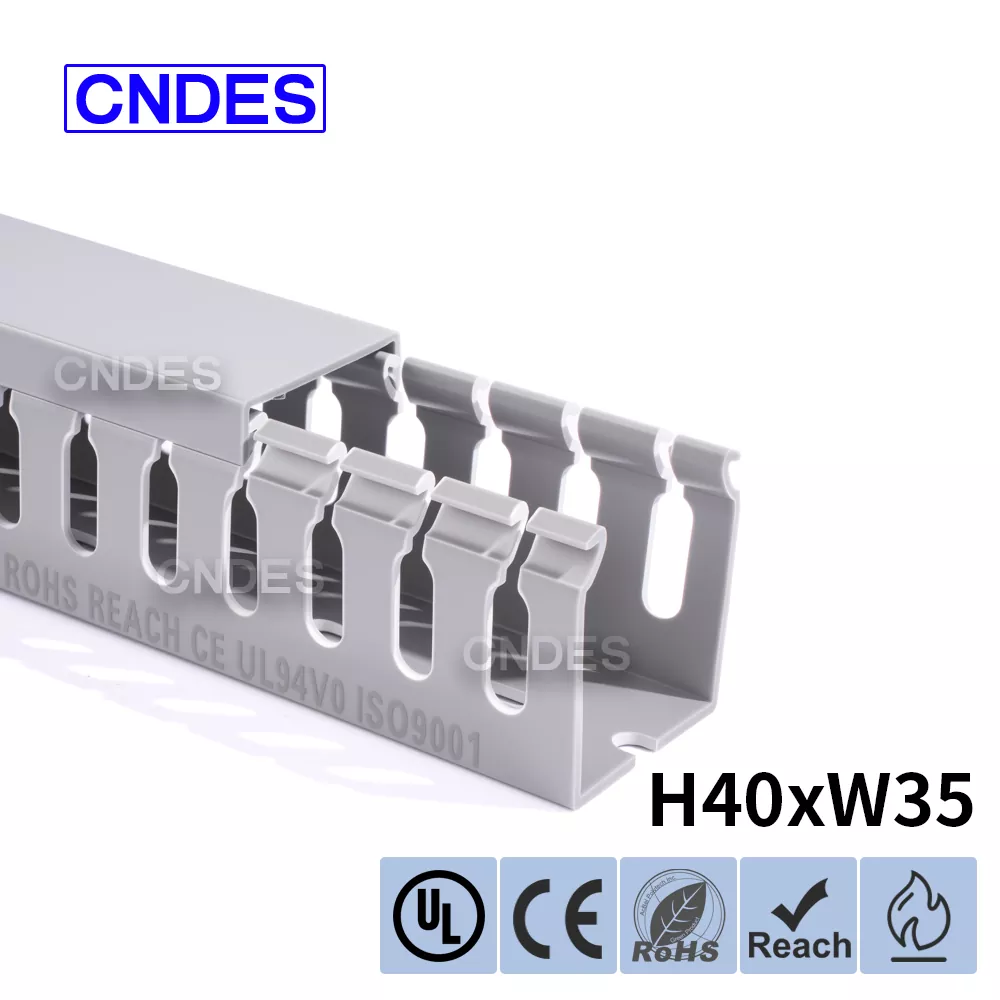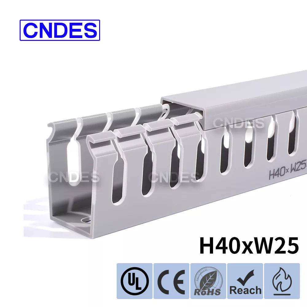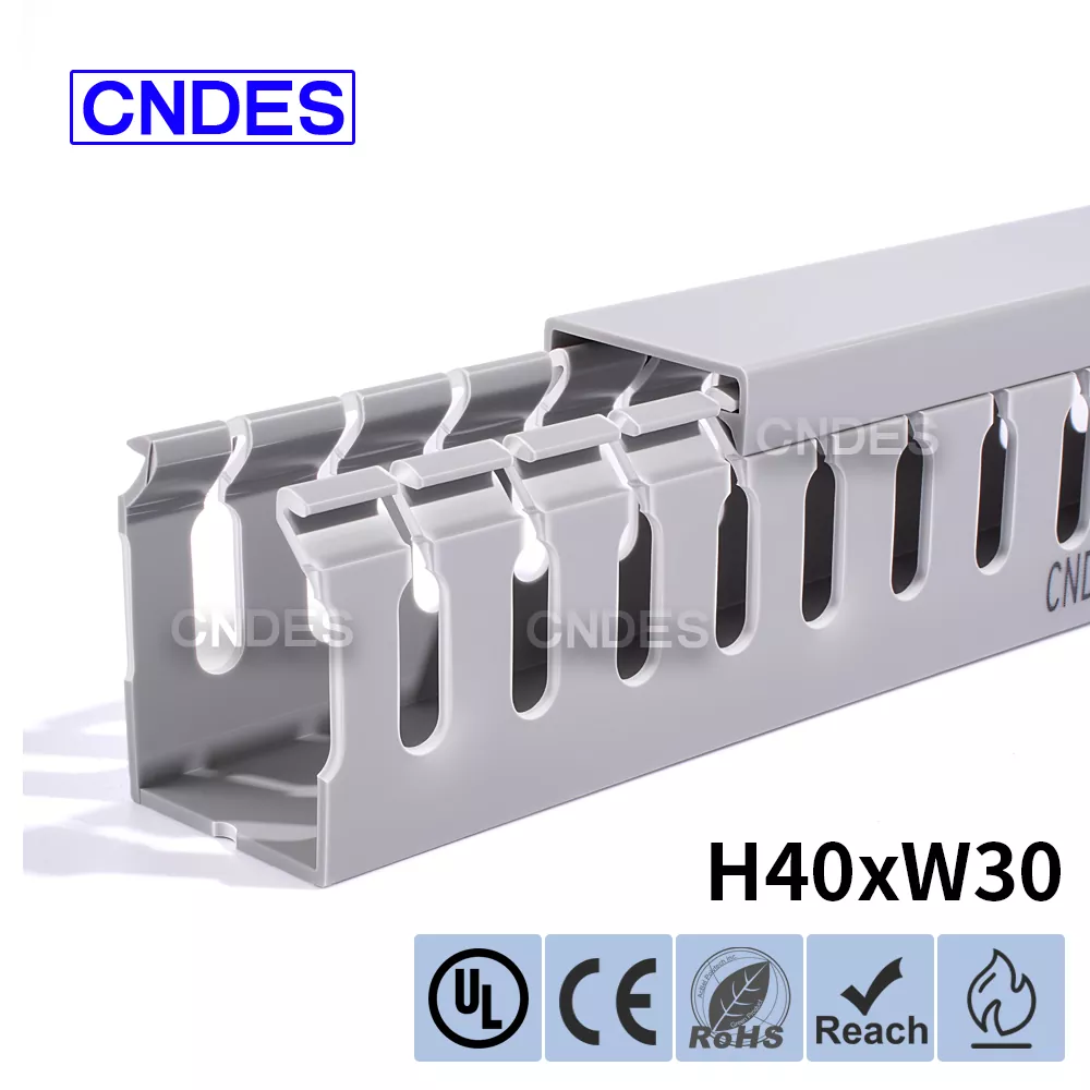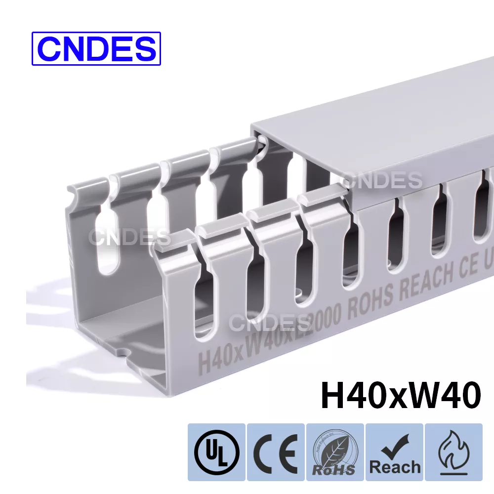 CNDES is een toonaangevende fabrikant en leverancier van gesleufde PVC-bedradingskanalen. Hier introduceren we onze kabelgoten met een hoogte van 40 mm, waaronder 40*25, 40*30, 40*35, 40*40 en 40*60.