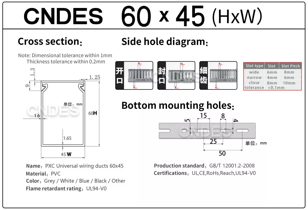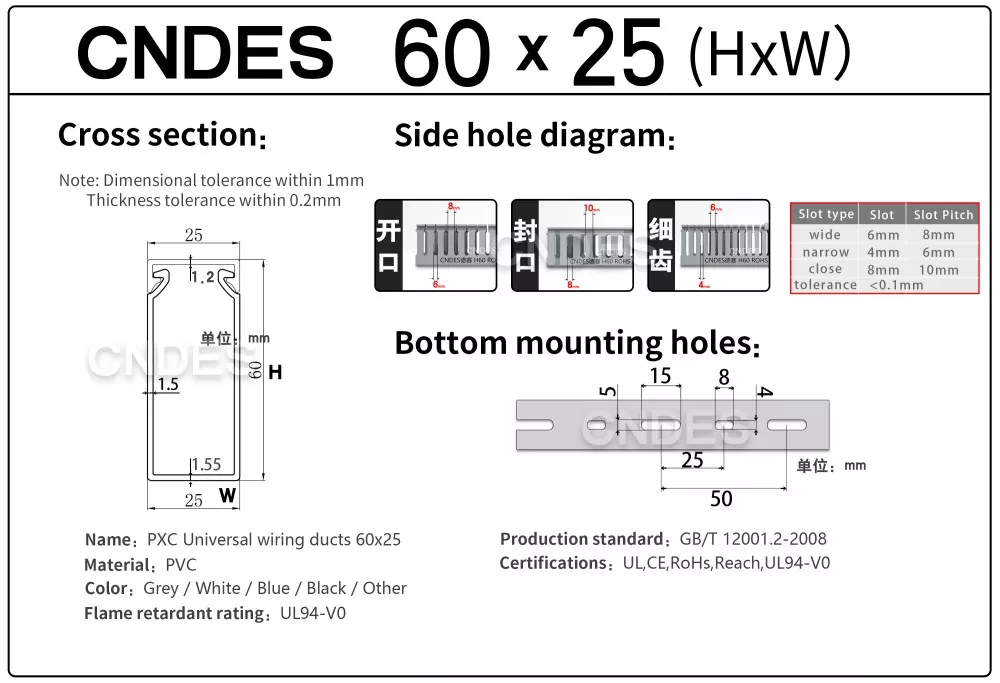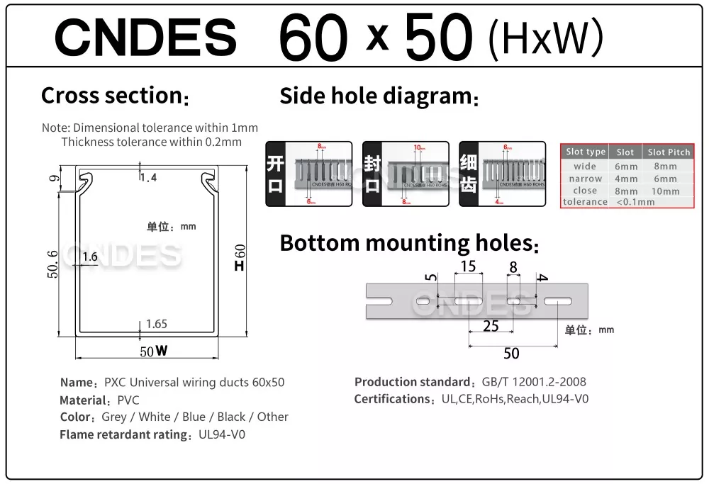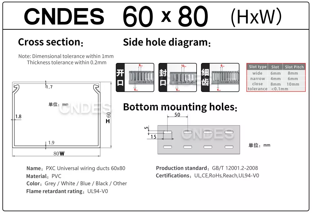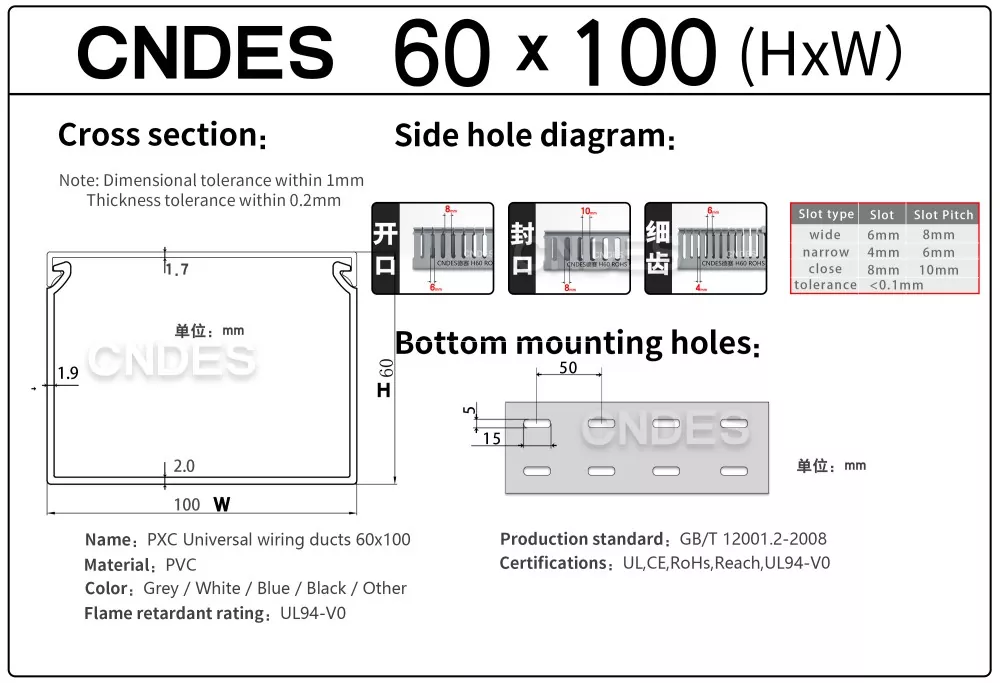 Bij CNDES bieden we uitgebreid maatwerk voor bedradingskanalen. Onze diensten variëren van gespecialiseerde functionele kenmerken (antistatisch, UV-bestendig, gemakkelijk te breken) en volledige dimensionale aanpassingen (lengte, hoogte, breedte, gatpositie/profiel/steek) tot esthetische merkopties (aangepaste kleuren, logo, tekstbedrukking). Wij bieden ook zelfklevende achterkant aan.