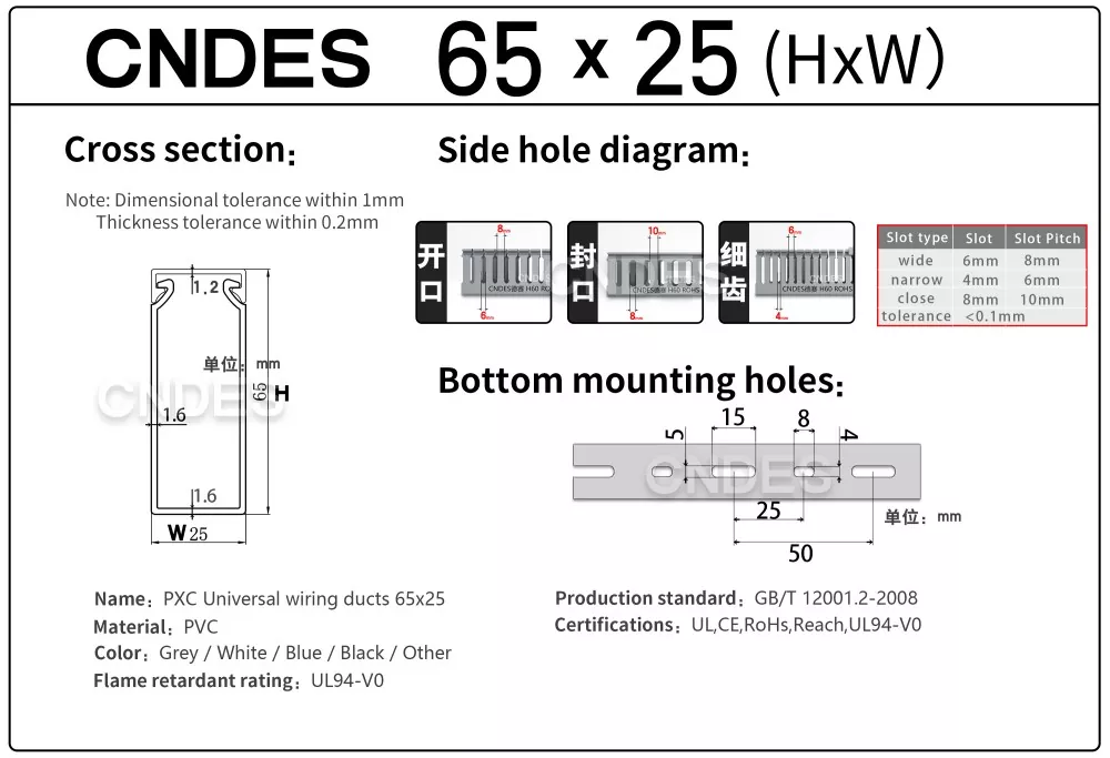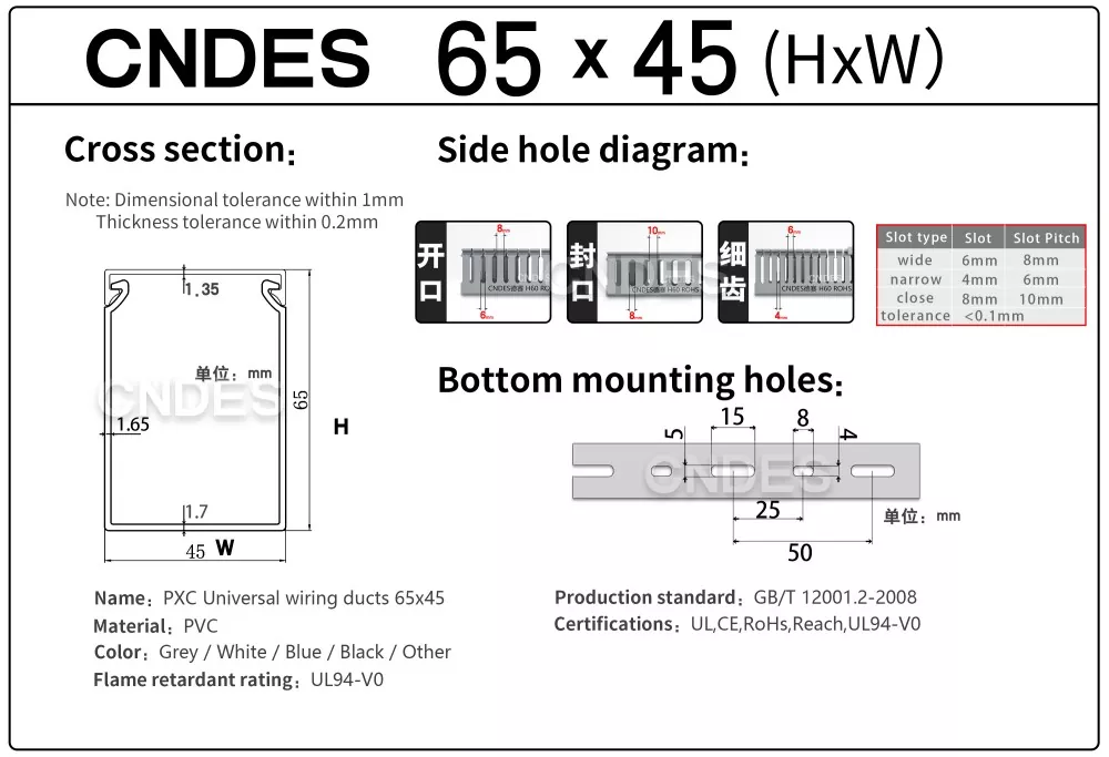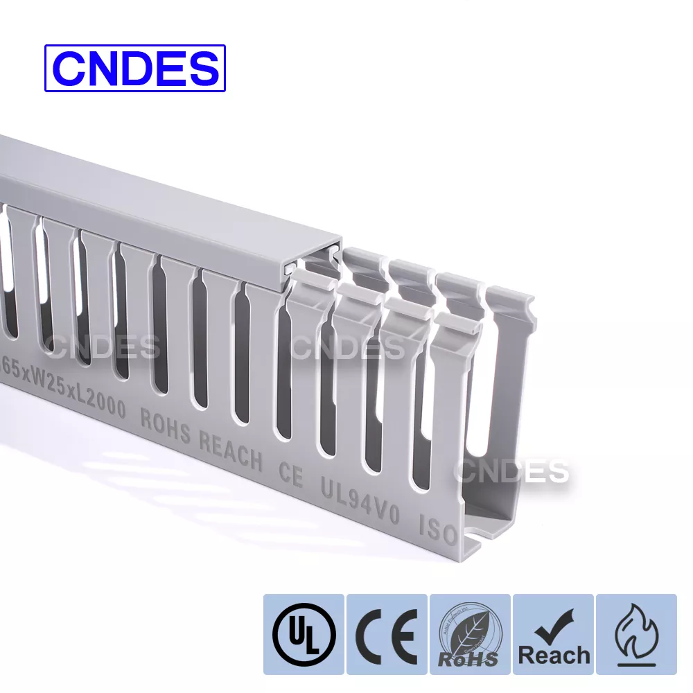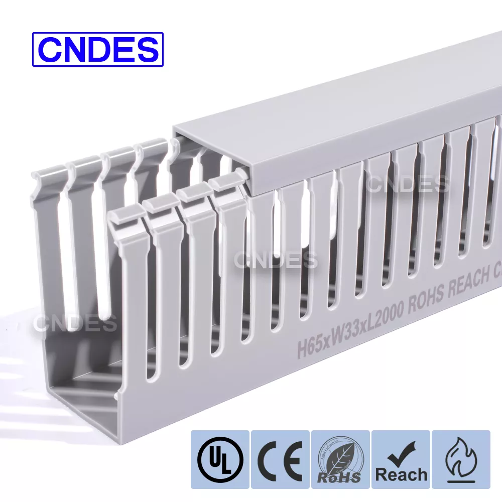 CNDES is een fabriek voor PVC-kabelbedradingskanalen met 24 jaar ervaring. De op maat gemaakte industriële kabelgoot met sleuven van 65 mm hoog is een ideale oplossing voor het organiseren en beschermen van bedrading in omgevingen met hoge dichtheid, zoals industriële bedieningspanelen, automatiseringsapparatuur en machine-installaties. Met een hoogte van 65 mm biedt hij voldoende ruimte voor grotere kabelbundels en zorgt tegelijkertijd voor optimale bescherming tegen omgevingsfactoren zoals stof, vocht en mechanische schade.