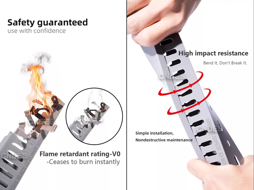 Onze 80×50 PVC-paneelkabelorganizer met sleuven is milieuvriendelijk, vlamvertragend en zeer slagvast en heeft meerdere gezaghebbende certificeringen doorstaan.