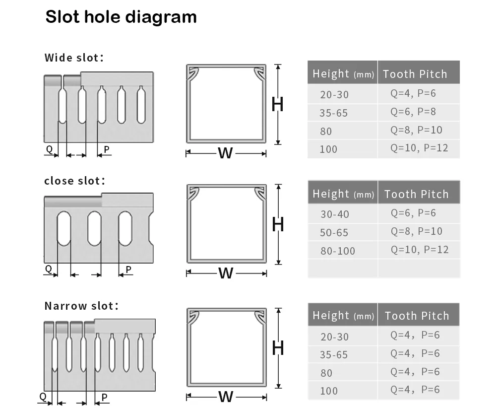 De specificaties van de kabelgoot worden uitgedrukt in hoogte * breedte, waarbij de eenheid mm is. Bepaal eerst de benodigde maat van de kabelgoot, bijvoorbeeld 80 mm hoog en 40 mm breed. Selecteer vervolgens de breedte van het uitlaatgat op basis van de dikte van de bedrading, brede tanden (8 mm) of fijne tanden (4 mm). Het wordt aanbevolen dat de daadwerkelijke kabel niet meer dan 70% van de laderuimte in beslag neemt.
