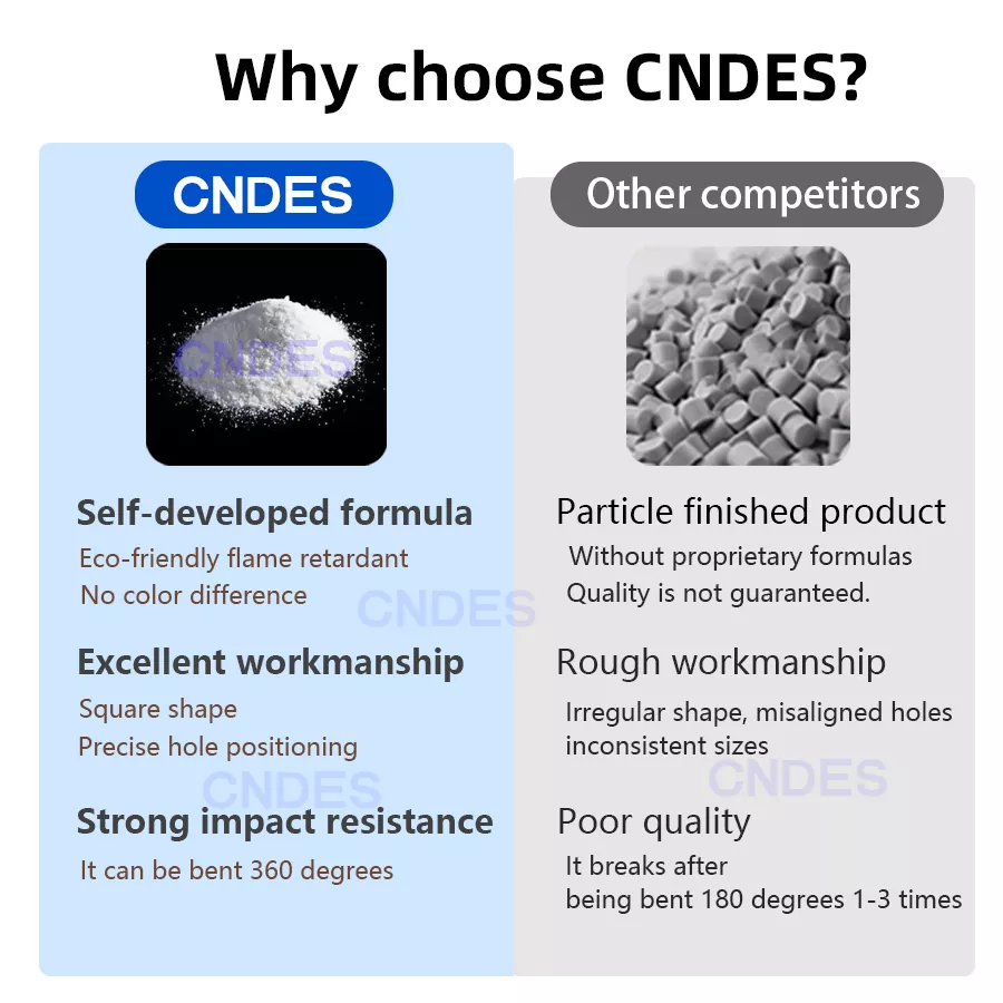 Onze formule is milieuvriendelijk en vlambestendig. Het zorgt ervoor dat er geen kleurvariatie is tussen verschillende batches en behoudt sterke fysieke eigenschappen in onze bedradingskanalen, waardoor ze bestand zijn tegen herhaaldelijk buigen van 180° zonder te breken.